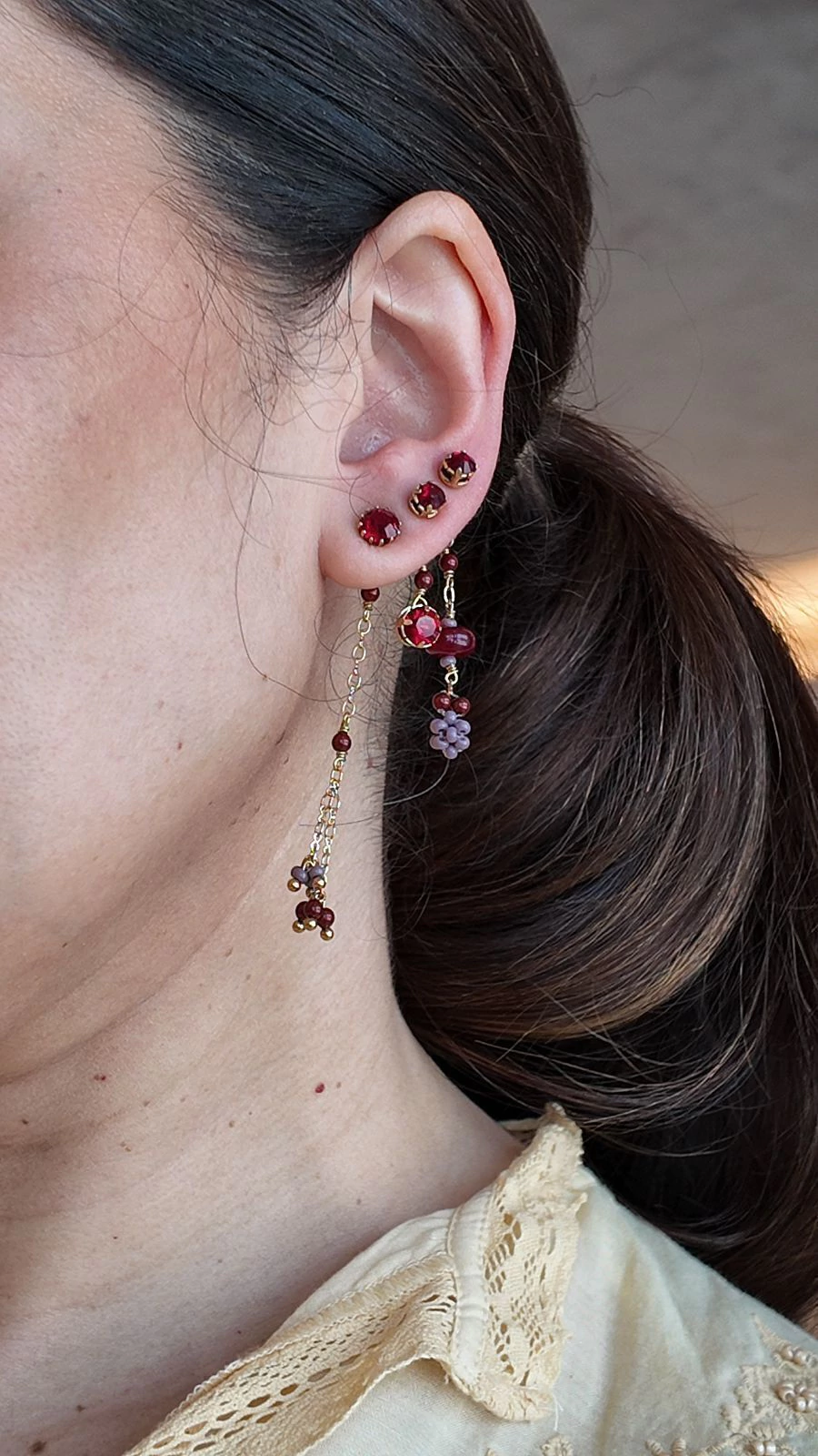 Trio de brincos pendentes com uma mistura encantadora de cristais lavanda e vinho, criando um contraste único que é a cara do verão. Os detalhes dourados trazem um toque de brilho e elegância, enquanto o design versátil permite combinações criativas — perfeitas para quem adora um visual leve, colorido e cheio de personalidade.